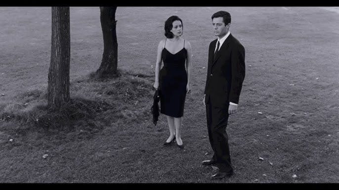 When watching an Antonioni film, one must always take note of the ending. His endings are perfect, surprising, and open to debate and meaning-making. By comparison, this one is almost conventional, as the camera wanders away from Giovanni and Lidia, focusing instead on more alive subjects: a group of trees. It is then that we realize that we have been the wanderers, watching and wishing to connect to what we see and to make meaning of the unexplained actions of those we have been following. In the end, however, we lose interest in such walking still-lifes and continue our peregrination.