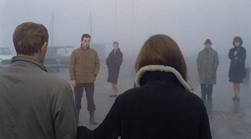 What is the answer—the cure—for Giuliana? This is an Antonioni film, so we’ll never know. But, by the film’s end, she has started to find ways to express it better. “I just have to accept that whatever happens to me, that’s my life,” she stammers to a stranger who doesn’t speak Italian. “There is something awful about the world,” she finally enunciates to Richard Harris’s character, “but I don’t even know what it is. No one will tell me.” Both of these statements hit me hard and conveyed so much truth about my experience in this world that the film’s subsequent end did not feel random (as it must have to others). Reaching those sentences, that depth of description of her life, is a true arrival and breakthrough. Giuliana will not feel any more at home in the world of “factories, colors, people, everything” than she did to start with, but she has found words to root her confusion in, and that is what will allow her to keep a grasp on her sanity. They may not be answers, but they are footholds. And we could each breathe a little easier.
